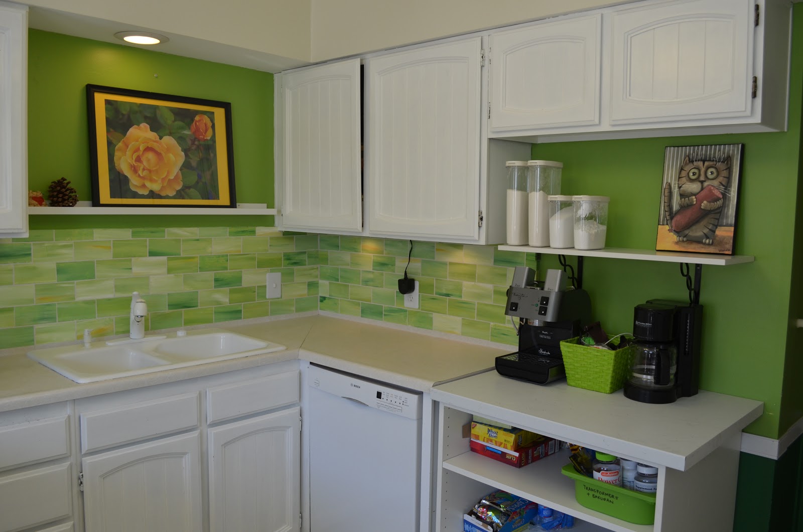 painted backsplash with faux tiles -- lots of examples of